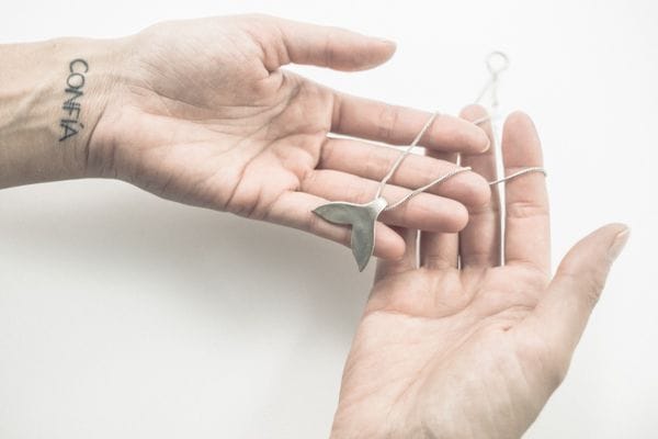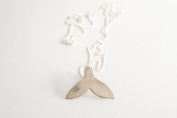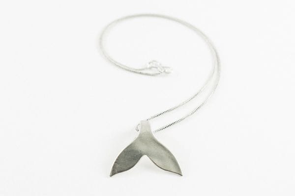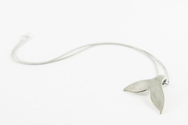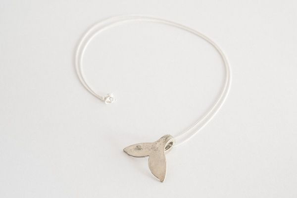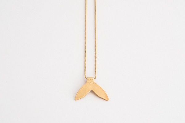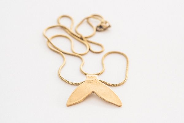 Collar hecho a mano con una cucharilla de postre antigua de plata o alpaca, transformada en un colgante con forma de aleta de ballena o de sirena. El modelo dorado es bañado en oro de 24 kilates.