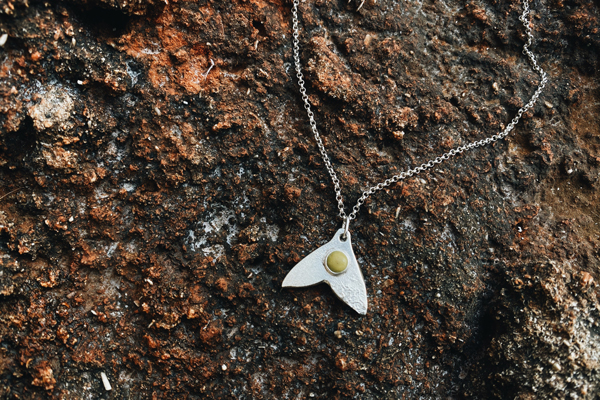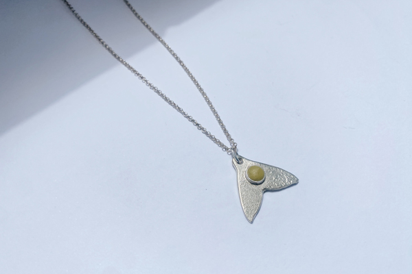 El tono plateado combina bonito con el color del microplastico y el colgante en forma de cola de ballena hace que la joya tenga un gran simbolismo y significado