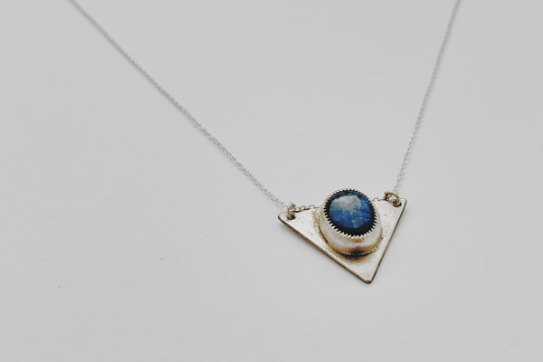 Collar único creado con el final de una cucharilla de plata reciclada y modificada cortada con forma de tirangulo. La geometría sagrada además la he decorado con una labradora en forma ovalada engastada en plata con un hilo plano con detalle zig zag  y combinado con una cadena de plata 40cm con extensión hasta 45cm