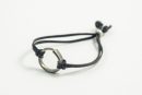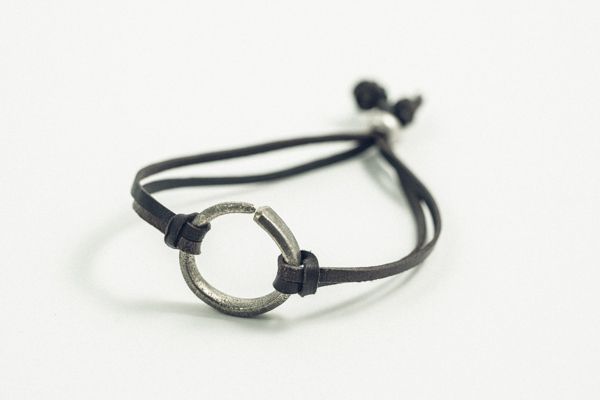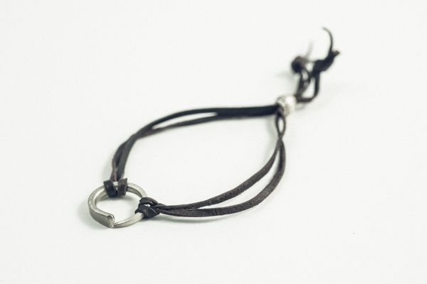 Adjustable bracelet handmade with a reused fork handle in the shape of a circle through which I have passed several strips of leather to make an adjustable bracelet or anklet.