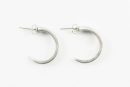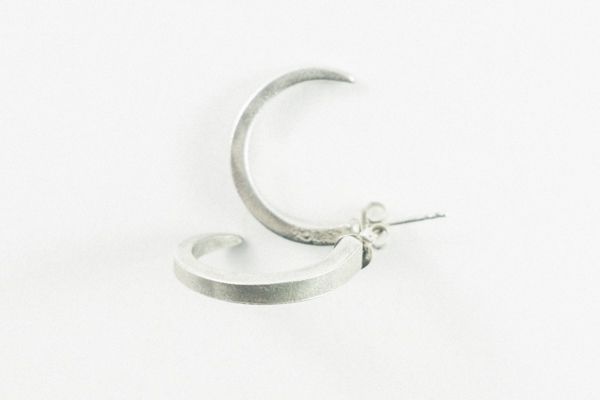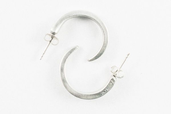 Este modelo de pendientes los creo tanto en la versión en plata como la versión dorada, creada con las púas de tenedores de postre de plata y posteriormente una vez están creados los pendientes lo llevo a bañar en oro de 24 kilates y 3 micras. Estos pendientes de aro abierto están creados usando dos púas de tenedor de postre en plata, haciendo un aro que pasa por el orificio de la oreja con un perno de plata.
