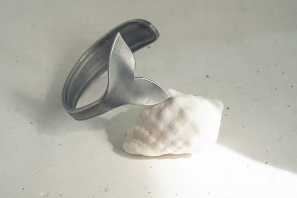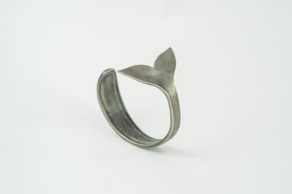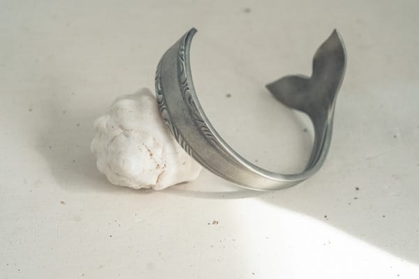 Pulsera ajustable creada a mano con una cuchara antigua de alpaca con unos detalles en el mango. El diseño de la cola de ballena o sirena está creado utilizando la parte cóncava de la cuchara para crear la forma de cola. Al estar creadas a mano, todas las piezas tienen algo que las hace especiales y únicas.