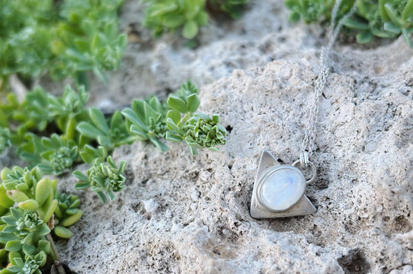 El collar triángulo está compuesto por un colgante con la forma geométrica sagrada de 3 lados sacado de la parte cóncava de una cuchara de plata, en el cual engasté una piedra luna en la parte superior del triángulo y sobre el engaste lleva un arco con hilo de plata del que se engancha la anilla de plata para coger la cadena.